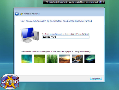 In het scherm kun je de aangegeven naam laten staan of deze veranderen in een eigen gewenste naam. Eronder staat de mogelijkheid om een bureaublad uit te kiezen uit de zes standaard aangegeven wallpapers. Ook dit is natuurlijk weer aan te passen na installatie en hoeft niet perse hier opgegeven te worden. Als je dat wel wilt klik je op 1 van de wallpapers en deze wordt direct getoond op de achtergrond. Druk dan op volgende.