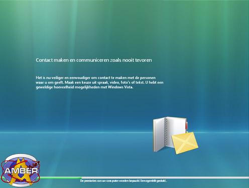 Als allerlaatste stap worden de prestaties van de pc gemeten om hier een cijfer aan toe te kennen. De groene voortgangsbalk bijna onderaan geeft aan hoever de meting is. Erboven roteren een aantal teksten. De meting zal uiteindelijk er voor zorgen dat een cijfer wordt toegewezen aan je pc tussen de 1 en 5 als eindscore. Hoe hoger het cijfer hoe beter je pc aan Vista voldoet.