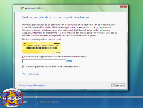 Dan komt het scherm met de productcode. Wat in de installatie van Windows XP nogal onlogisch is, is dat je de productcode pas invoert vrij op het eind in plaats van in het begin van de installatie. Dit is met Windows Vista dus gewijzigd.
