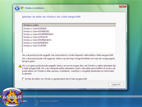 Als je dus geen product code hebt ingevoerd krijg je wel onderstaand scherm. Selecteer hier in het rijtje de versie van Windows Vista die je wilt installeren en waarvan je een productcode hebt die je later na installatie kunt invullen. De keus is er uit alle 7 versies. Selecteer de versie en vink onderaan het vinkje aan voor "Ik heb de editie van Windows geselecteerd die ik heb aangeschaft" en klik op volgende.