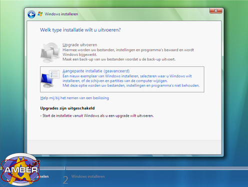 Daarop volgend krijg je de vraag welk type installatie het moet gaan worden. 2 opties heb je hier, een upgrade of een aangepaste installatie. Je kunt voor een upgrade kiezen om zodoende een bestaande installatie van Windows XP te upgraden naar Windows Vista, hiervoor had je de installatie moeten starten vanuit Windows XP zoals aan het begin van dit artikel is aangegeven. Hiermee worden alle bestanden en instellingen en programma's bewaard. Mochten er redenen zijn waarom de installatie niet voortgezet kan worden door bijvoorbeeld te weinig ruimte op de harde schijf zullen hier meldingen van staan onderaan in dit scherm in het zwart.