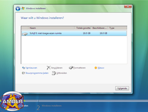 Voor de installatie moet worden aangegeven waar je Vista wilt installeren. Selecteer hier de partitie waarop je de schijf wilt installeren, in het scherm is er maar 1 partitie waarop geinstalleerd kan worden. Ook de mogelijkheid om hier extra partities aan te maken, te verwijderen, formatteren etc. de opties hiervoor haal je tevoorschijn door een druk op de knop "Stationsopties" en zie je hieronder ook in het scherm. Klik dan op volgende.