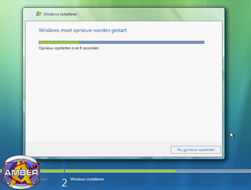Op een gegeven moment zal onderstaand scherm tevoorschijn komen met de melding dat de pc herstart moet worden. Dit gebeurt automatisch na 15 seconden. Als je het iets sneller wilt doen klik je op de knop "Nu opnieuw opstarten" en de pc herstart.